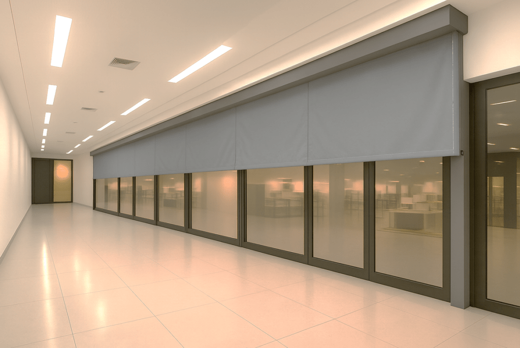 Las cortinas permanecen ocultas en un cofre metálico de acero galvanizado o lacado RAL, garantizando una integración discreta en el entorno. Su diseño modular permite diversas configuraciones, ya sea para ocultar completamente el sistema o integrarlo con instalaciones vistas de techo. El mecanismo de enrollamiento ofrece una respuesta rápida y fiable, sin necesidad de suministro eléctrico en caso de emergencia, manteniendo el sistema invisible y funcional cuando no está activado.